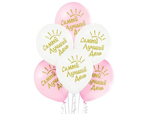 Высококачественный шар из натурального латекса. Ассорти из 2-х цветов - белого и розового. Одного типа - пастель - матовый оттенок цвета. Шары с двусторонним шелкографическим рисунком "Самый лечший день" в пакете с большим полем печати. Идеальный ассортимент для розничной продажи воздушных шариков и украшения праздника.