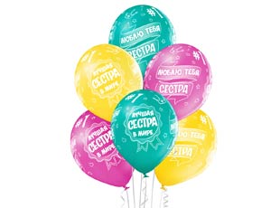 Высококачественный шар из натурального латекса. Ассорти из 3 цветов , одного типа - пастель - матовый оттенок цвета. Шары с пятисторонним - круговая печать, с шелкографическим рисунком на тему Лучшая Сестра в мире, Люблю тебя, Сестра. Предназначен для розничной продажи воздушных шариков. Идеальный ассортимент для праздничных оформлений, т.к. при плетении из него гирлянд - рисунок будет очень хорошо виден.