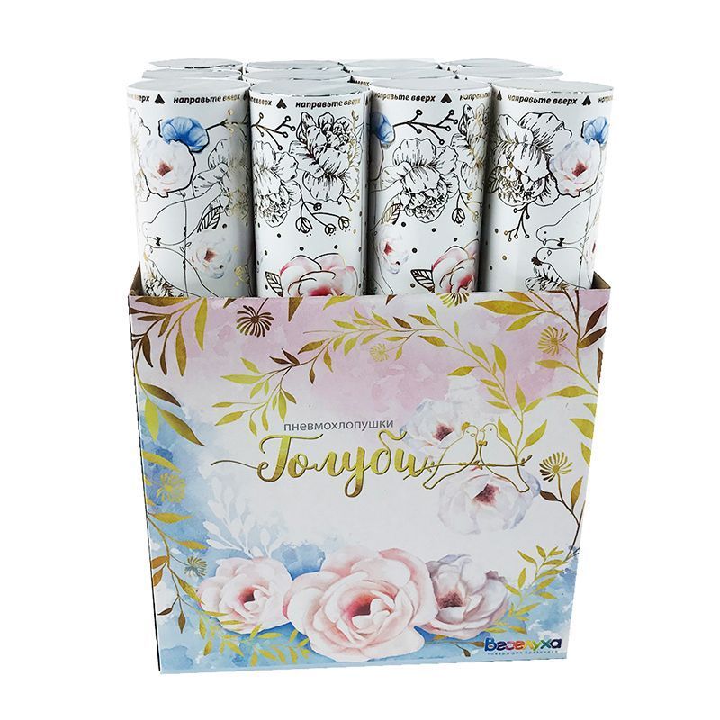 Дизайн хлопушки выполнен с тиснением фольгой, именно поэтому хлопушка смотрится ещё более нежной и подходящей для свадебного события. Наполнитель – серебряные фольгированные голуби.