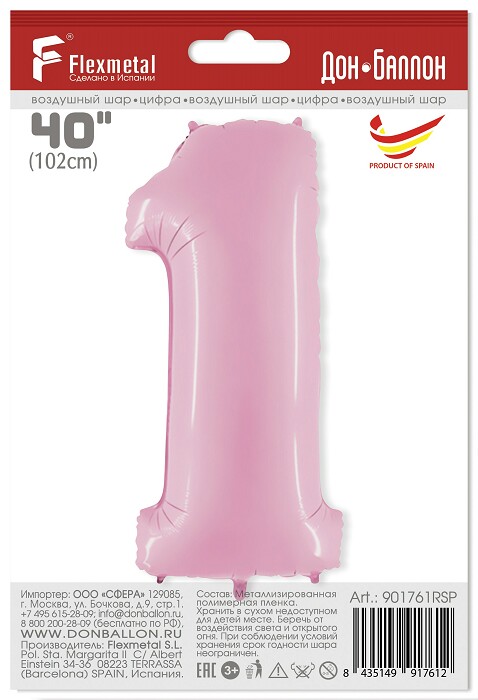 Шар фольга Цифра 40" Fm Розовый Pink "1" 1207-4762 (упак)