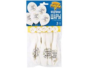 Набор шаров из натурального латекса. 5 белых матовых шаров с двухцветным дизайном - С днём рождения. Конфетти. Печать с одной стороны.
