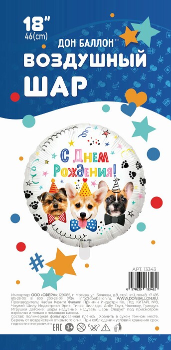 Шар фольга 18''/FL круг С Днем Рождения Собачки