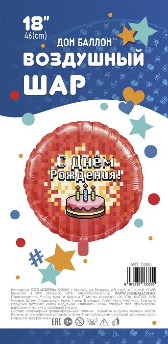 Шар фольга 18''/FL круг С Днем Рождения Пиксели торт Красный