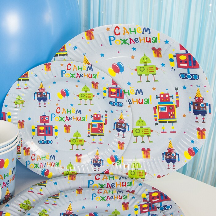 Тарелки бумажные 180мм Разноцветные роботы уп6 ВолВес