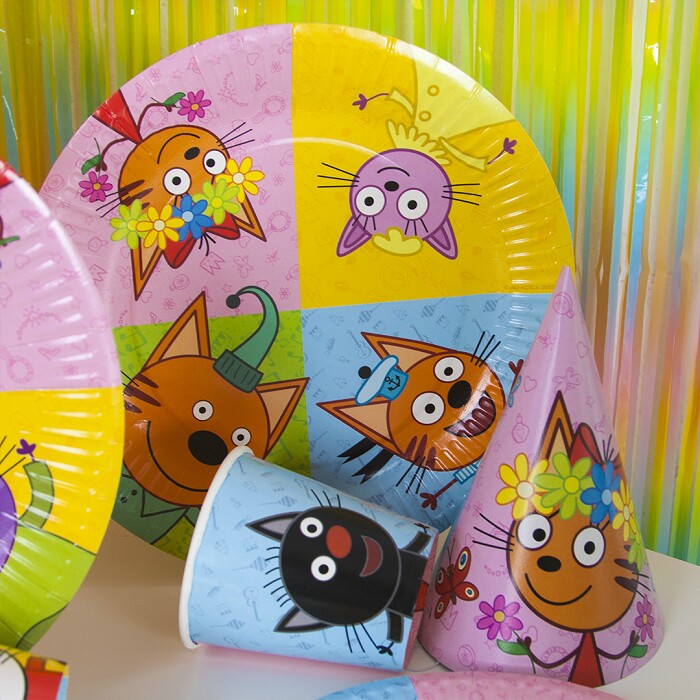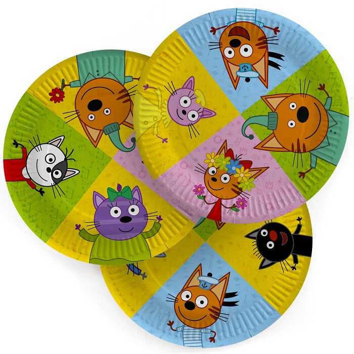 Красочная одноразовая посуда с любимыми персонажами мультфильма "Три Кота" станет дополнительным украшением праздника, а также поможет минимизировать время организации торжества.