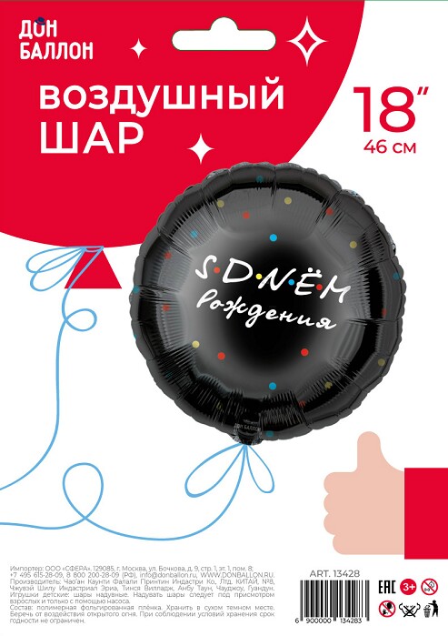 Шар фольга 18''/FL круг С Днем Рождения черный