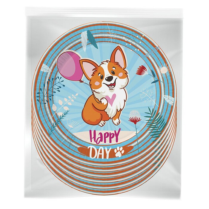 Набор бумажных тарелок «Корги» − стильный элемент для украшения стола на пикнике, вечеринке или в День Рождения. На каждой тарелке изображены забавные собачки корги.