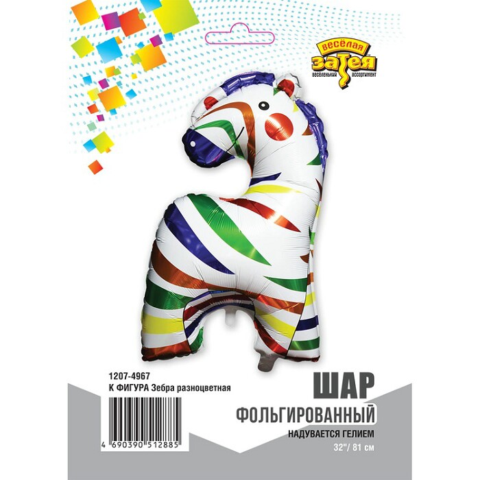 Сложная, объемная фигура в форме яркой, разноцветной зебры. При надувании рекомендуется использовать гелий. Имеет встроенный клапан - что упрощает надувание. Тонкая миларовая (фольга на полиэтиленовой основе) пленка позволяет шарам не сдуваться от недели до одного месяца. Упакован в красочный пакет, с цветным изображением шара, что позволяет выставлять товар в не надутом виде. Размер шара 52x81см.