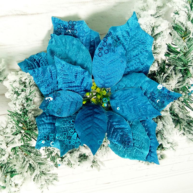 Пуансеттия "Люкс" Текстиль Синяя – оригинальный цветок из искусственных материалов, украшенный пайетками. Если Вы выбрали синий цвет основой для Вашего новогоднего оформления, Вам точно не обойтись без этого красивого праздничного украшения.