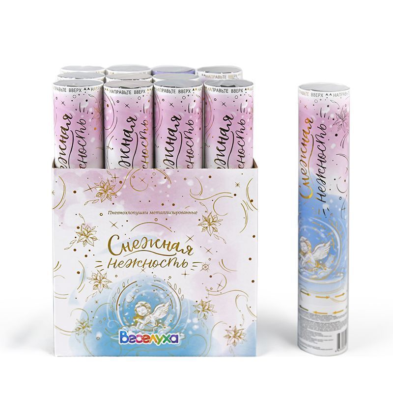 Пневмохлопушка «Снежная нежность» идеальна для любого праздника. Нежный воздушный дизайн хлопушки создан на два самых волшебных праздника: свадьбу и новый год.