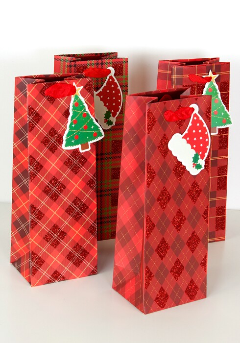 Пакет под бутылку Новогодний в клетку Дизайн №4 Красный с блестками 34,5х12 5х10см