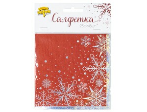 Двухслойная салфетка с искрящимися голографическими снежинками на красном фоне. Используется совместно с другими элементами коллекции по дизайну (тарелки, стаканы и т. п.) как украшение стола или по своему непосредственному назначению.