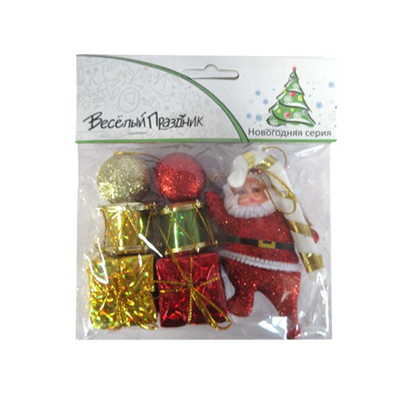 Набор елочных украшений содержит 8 предметов: подарки, барабаны, шары, Дед Мороз, трость. Украшения выполнены в классической цветовой палитре и впишутся в декор практически любой елки.