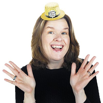 Золотая мини-шляпка высотой 6 см с надписью Happy New Year. Шляпка на резинке будет смотреться и нарядно, и необременительно для её обладателя - можно надеть даже поверх причёски, нисколько её не повредив.