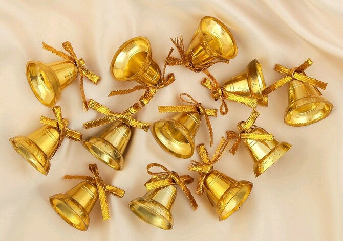 Игрушки на елку Колокольчики со звездочками и бантиком 2см золото (уп12)