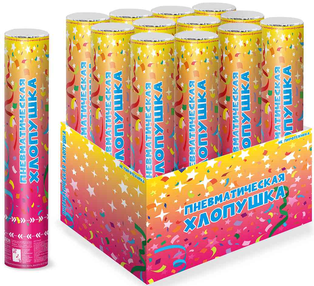 Пневмохлопушка размером 30см. Дальность выстрела 4-6м. Пневмохлопушка не пиротехническое изделие, поэтому абсолютно безопасно и может применяться в любых помещениях и на улице. Срабатывает за счет сжатого воздуха, и приводится в действие простым поворотом нижней части по часовой стрелке, удерживая одной рукой верхнюю часть хлопушки. Пневмохлопушка представляет собой пластиковый или бумажный корпус, в виде цилиндра состоящий из двух частей: пневматического баллона со сжатым воздухом и цилиндра с наполнителем. Пнемохлопушки украсят праздник выстрелами из конфетти, как на улице, так и в помещениях. Выстрелы из хлопушек очень эффектно смотрятся на видео и фото съемке.