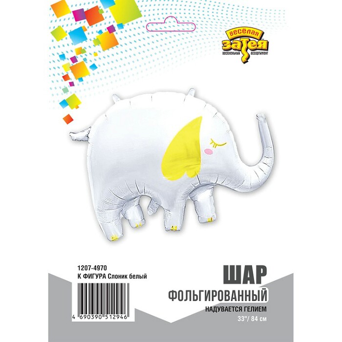 Сложная, объемная фигура в форме милого слоника белого цвета. При надувании рекомендуется использовать гелий. Имеет встроенный клапан - что упрощает надувание. Тонкая миларовая (фольга на полиэтиленовой основе) пленка позволяет шарам не сдуваться от недели до одного месяца. Упакован в красочный пакет, с цветным изображением шара, что позволяет выставлять товар в не надутом виде. Размер шара 59x84см.
