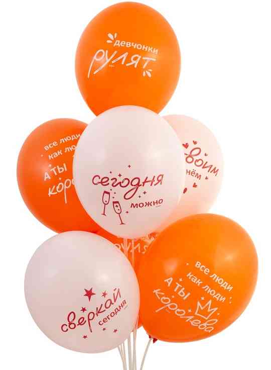 Высококачественный шар из натурального латекса. Шары белого и розового цвета. Пастель - матовый оттенок цвета. Шары с двусторонним шелкографическими рисунком - надписями: Девчонки рулят; Все люди как люди, а я королева; Сегодня можно все; Сверкай сегодня; С твоим днем. Идеальный ассортимент для розничной продажи воздушных шариков и украшения праздника. Воздушные шары изготавливаются из экологически безопасного 100%-ного натурального латекса. В окружающей среде разлагаются на безопасные компоненты примерно с той-же скоростью, как обычные листья деревьев. После использования лопнуть и утилизировать как бытовой отход.