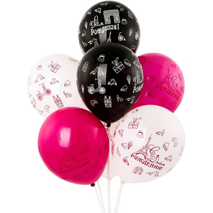 Шары из натурального латекса c шелкографическим рисунком с главными символами Парижа: Эйфелевой башней и Триумфальной аркой и с надпмсью С Днем Рождения, расположенным по всему шару. В наборе используются шары белого, черного и красно-розового цвета. Тип шара пастель - матовый оттенок цвета. Предназначены как для использования в розничной продаже, как в надутом, так и в не надутом виде так и оформлений детских праздников.