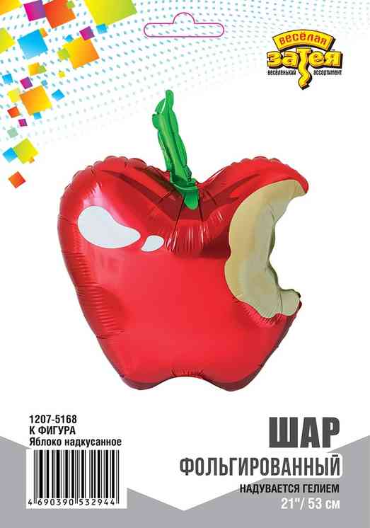 Сложная, объемная фигура в форме надкусанного яблока. При надувании рекомендуется использовать гелий. Имеет встроенный клапан - что упрощает надувание. Поставляется в красочной упаковке с цветным изображением шара, что позволяет выставлять товар в сдутом виде. Размер шара 47(Ш)х53(В) см.