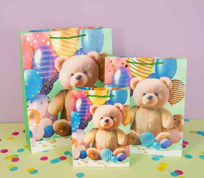 Пакет бумажный L 26х32см Мишка с шариками Дизайн №3 Металлик