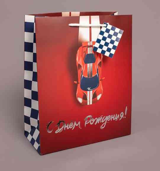 Пакет бумажный L 26х32см С Днем Рождения! (суперкар) Красный Металлик