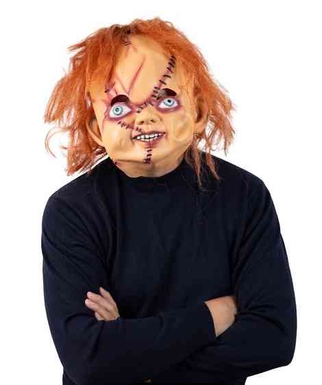 Карнавальная маска страшной куклы Чаки по мотивам известного фильма ужасов. Изготовлена из латекса, волосы - из синтетического материала. Отлично подходит для вечеринки Хеллоуин.