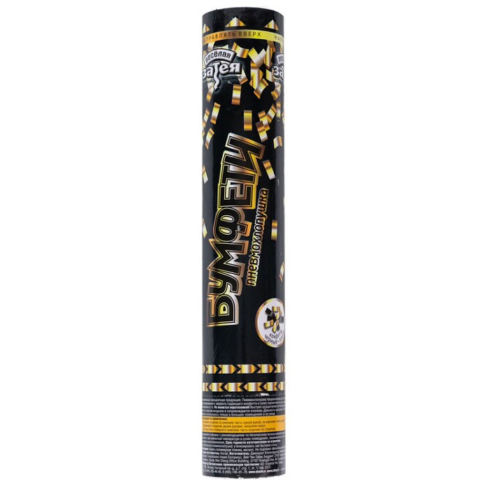 Пневматическое устройство, аналог хлопушки, абсолютно безопасное, предназначено для использования в помещении и на улице, дальность выстрела 6-8 м. Корпус хлопушки состоит из двух частей: пневматического баллона со сжатым воздухом и картонного цилиндра с наполнителем. Баллон изготовлен из металла, надёжен и безопасен при хранении и в использовании, обладает высокой прочностью, чтобы выдержать давление воздуха. Выстреливает прямоугольным фольгированным черным/золотым конфетти.