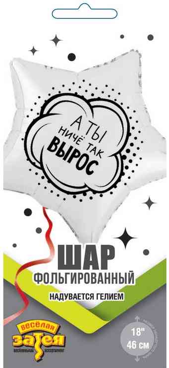 Фольгированный шар размером 18"/ 46см в форме звезды с оригинальным текстовым дизайном с долей юмора. Такой подарок создаст атмосферу праздника и веселья, а также станет интересным акцентом для фотозоны, предоставляя возможность всем участникам сделать креативные и яркие фотографии. Шар изготовлен из качественных материалов (полимерная фольгированная пленка). Шар имеет встроенный клапан, что упрощает надувание. Для надува рекомендуется использовать гелий. Поставляется в красочной упаковке с цветным изображением шара, благодаря чему можно выставлять товар в ненадутом виде. Внимание! Реальный цвет товара может незначительно отличаться от представленного на фотографии в зависимости от настроек вашего монитора.