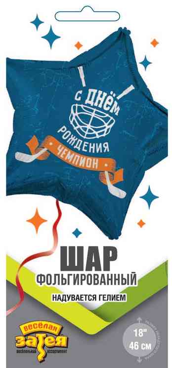 Фольгированный шар размером 18"/ 46см в форме звезды с оригинальным текстовым дизайном - это отличный способ поздравить лучшего хоккеиста с днем рождения. Такой подарок не только порадует именинника, но и создаст атмосферу праздника и веселья. Шар изготовлен из качественных материалов (полимерная фольгированная пленка). Шар имеет встроенный клапан, что упрощает надувание. Для надува рекомендуется использовать гелий. Поставляется в красочной упаковке с цветным изображением шара, благодаря чему можно выставлять товар в ненадутом виде. Внимание! Реальный цвет товара может незначительно отличаться от представленного на фотографии в зависимости от настроек вашего монитора.