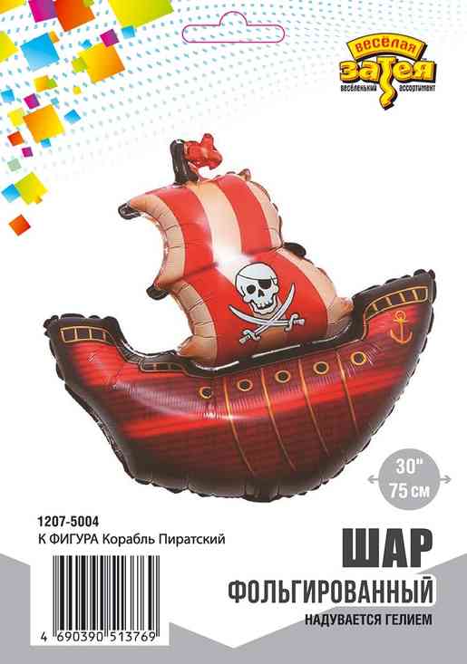 Сложная, объемная фигура в форме пиратского корабля. При надувании рекомендуется использовать гелий. Имеет встроенный клапан - что упрощает надувание. Шар упакован в красочную упаковку.
