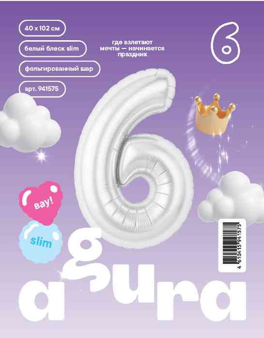 Шар фольга Цифра 40" AG Slim Белый блеск "6" (упак)