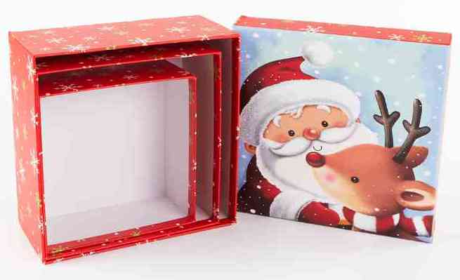 НГ Коробка квадрат 18х18х9см Дед Мороз и олененок Красный с блестками