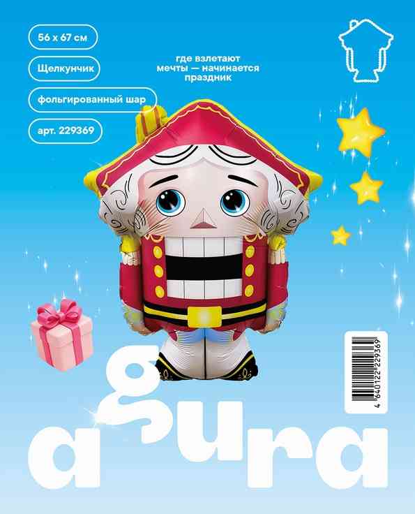 Воздушный фольгированный шар в форме Щелкунчика. Смотрится красиво как самостоятельно, так и в качестве дополнения к фонтану из воздушных шаров к новогоднему тожеству или просто для создания новогоднего настроения. Шар поставляется в ненадутом состоянии. Для того, чтобы шар летал, рекомендуем надуть его гелием. Плотно надутый шар запаивать не требуется – шар снабжен клапаном, который хорошо удерживает гелий внутри шара. Надутый гелием шар летает от двух дней. Не забудьте привязать надутый гелием шар лентой к грузику, чтобы он не улетел (гелий, лента и грузик не входят в комплект, а приобретаются отдельно). Шар снабжён красочной упаковкой с изображением товара, что удобно для выкладки в торговом зале магазина. Внимание! Цветовой оттенок шара в действительности может отличаться от представленного на фотографии в зависимости от настроек Вашего монитора.