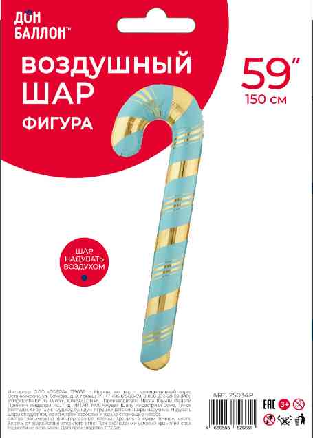 НГ Шар фольга фигура Леденец трость ГолубойЗолото (воздух) 59" 150смFL (упак)