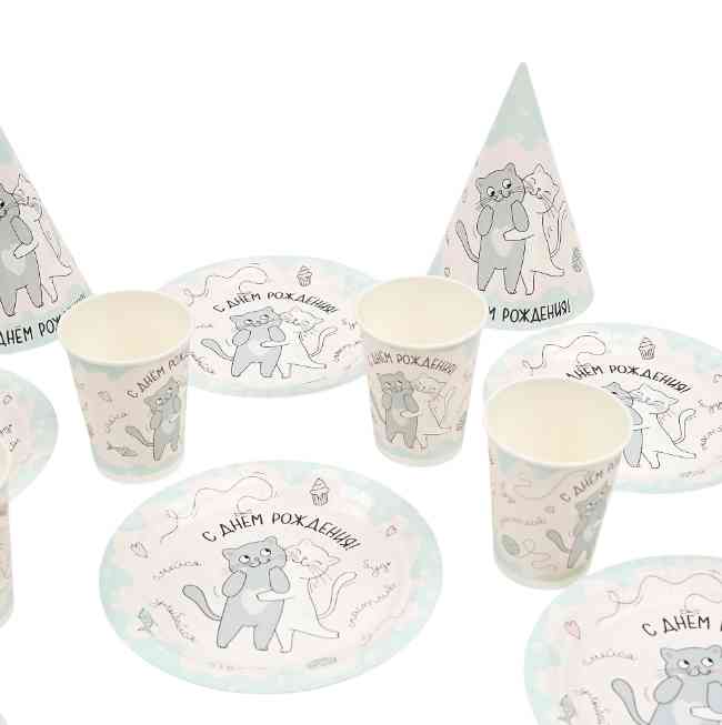 Оформите праздничный стол в стиле Милые Котики. Коллекция посуды представлена яркими тарелками и стаканчиками, салфетками, скатертью, для фото можно надеть праздничные колпачки.