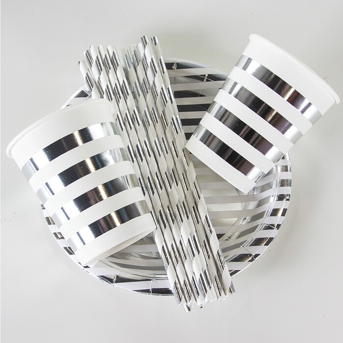 Трубочки для коктейля Полосы Белый Серебро металлик (уп12)